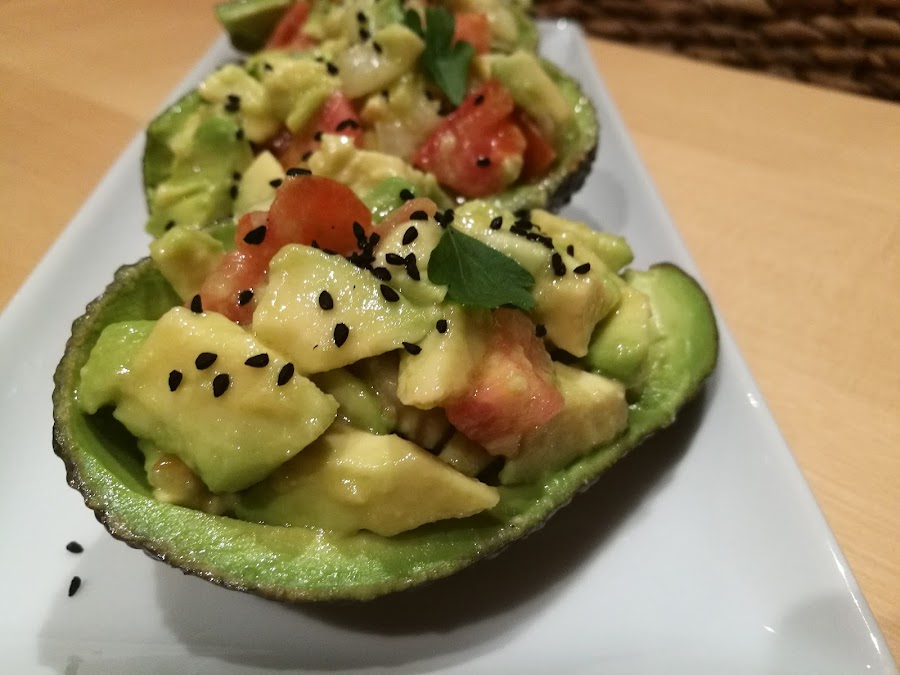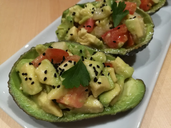 - Salpimentamos y añadimos aceite al relleno y dejamos reposar en la nevera hasta el momento de servir, que rellenaremos los cascos con el relleno y decoramos con cilantro o perejil y unas semillas de Nigella, o pimienta.