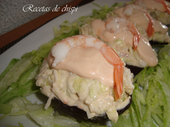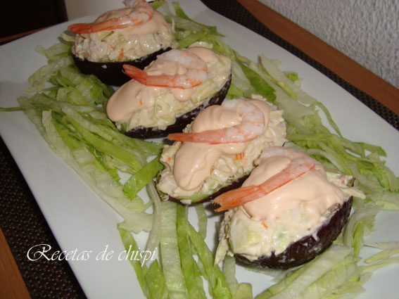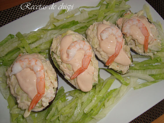 Con una cuchara rellenar los moldes de aguacate, poner por encima un poco de salsa y una gamba. Decorar con lechuga en juliana.