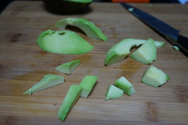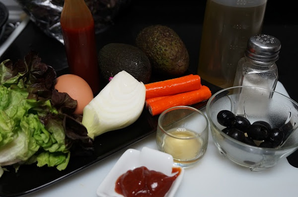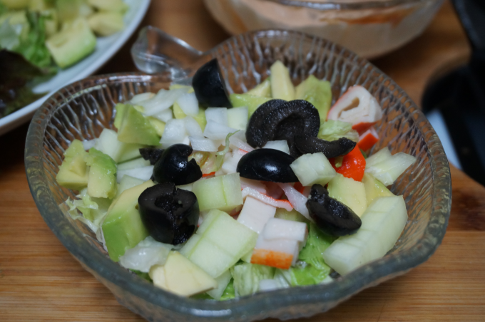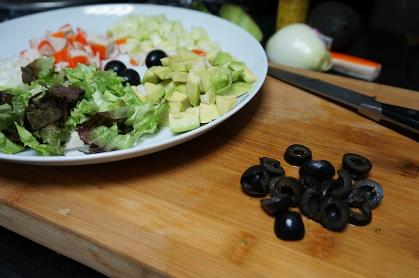 Cortamos los aguacates por la mitad sacamos el hueso, la carne del aguacate la rociamos con un poco de limón para que no se oxide y lo picamos. Picamos el resto de los ingredientes, el pepino, la cebolla, la lechuga, los palitos de cangrejo y unas aceitunas.