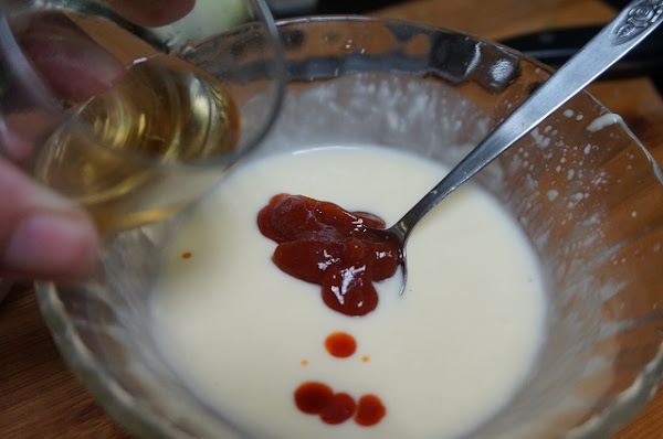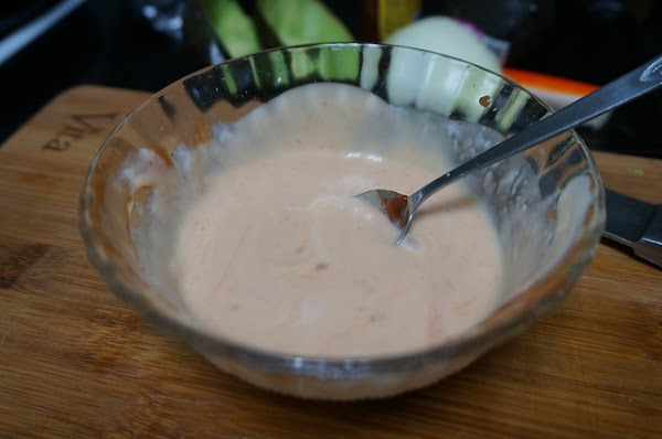 Preparamos la salsa. Hacemos una mayonesa o la compramos ya preparada, añadimos unas cucharadas de ketchup y unas cucharadas de coñac, esto es opcional. La vais probando y así la dejáis a vuestro gusto. Se guarda en la nevera hasta la hora de servir.