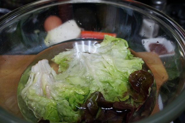 A la hora de servir preparamos los cuencos e iremos poniendo primero un poco de lechuga y encima el resto de los ingredientes. Cubrimos con un poco de la salsa.