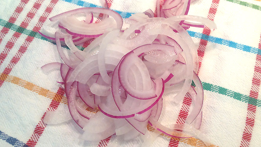 Saca la cebolla blanca y roja en juliana fina del agua con hielos y sécala con un trapo o en una centrifugadora.