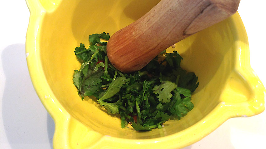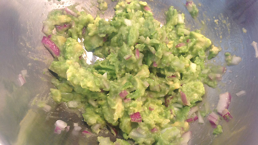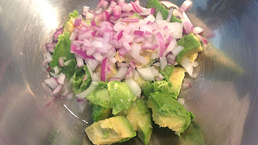 En un bol pon la carne troceada de un aguacate, la media cebolla cortada en trocitos, sal, pimienta molida, zumo de limón y cilantro fresco picado. Mezcla y reserva.