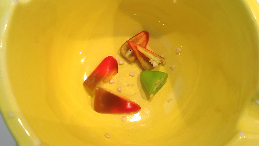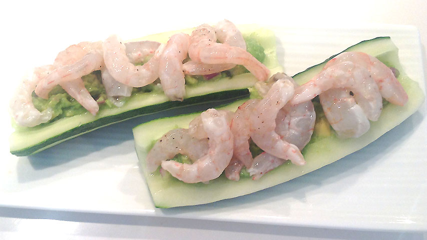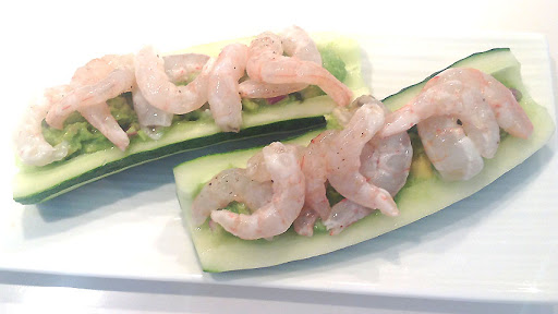 Sirve los platos poniendo las "barcas" de pepino con esta especie de guacamole que hemos hecho en el surco donde estaban las semillas. Las gambas que ya estarán cocinadas por el limón y frescas sobre él. El aguachile en mayor o menor cantidad -a tu gusto-, la cebolla roja y blanca en juliana decorando por encima y un poco de ralladura de la piel de un limón.