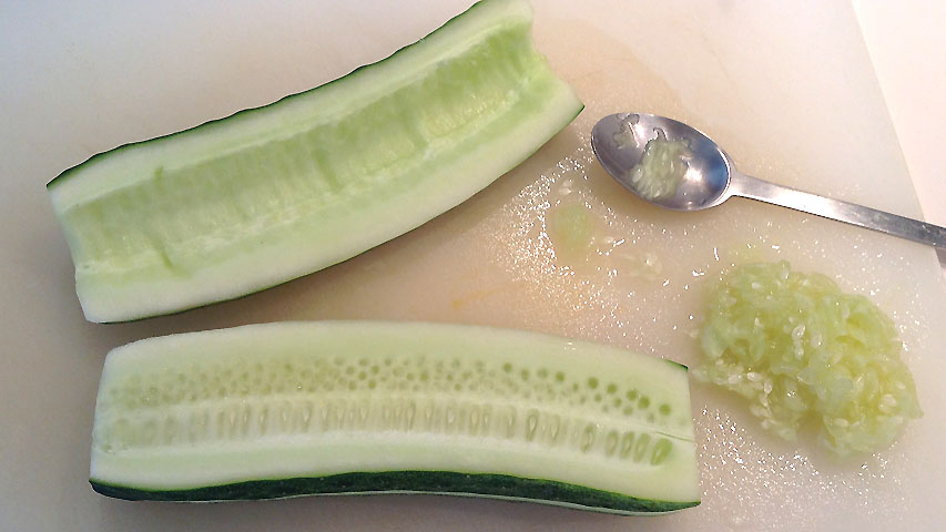 Enjuaga y seca los pepinos. Corta los extremos y abre por la mitad a lo largo. Retira las semillas centrales con una cucharita y seca el pepino con un papel de cocina.