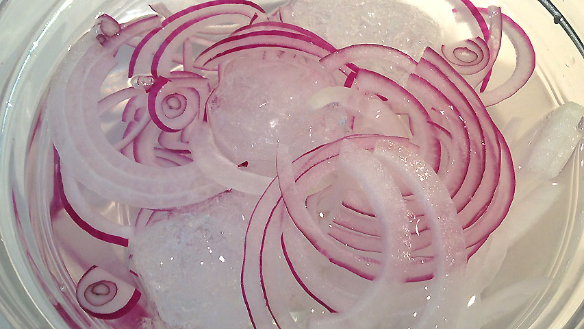 Pon la cebolla -blanca y roja- cortada en juliana en un bol con agua fría -con hielos-