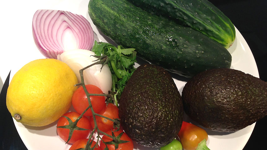 Las verduras utilizadas en la receta: limones, aguacates, pepino, tomates, chiles -guindillas-, cebolla blanca y roja y unos tomatitos cereza para decorar.