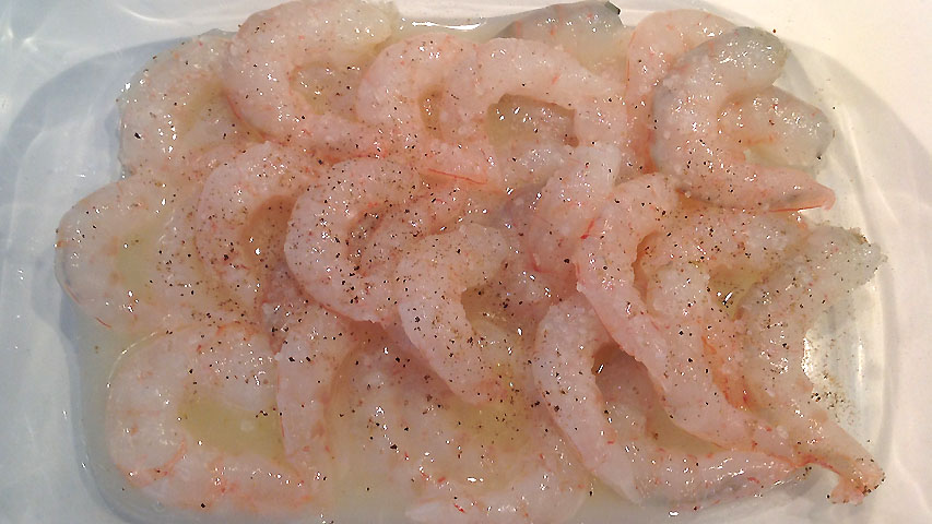 La gamba blanca pelada en el recipiente donde las voy a "cocinar" con el zumo de limón.