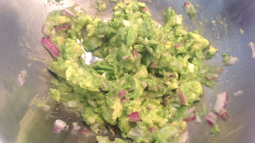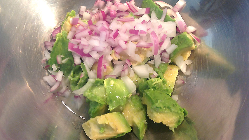 Preparo una especie de guacamole con aguacate troceado y cebolla roja picada en trocitos pequeños.