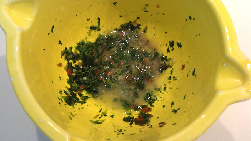 Hago un majado de los chiles con cilantro fresco, sal y pimienta molida.