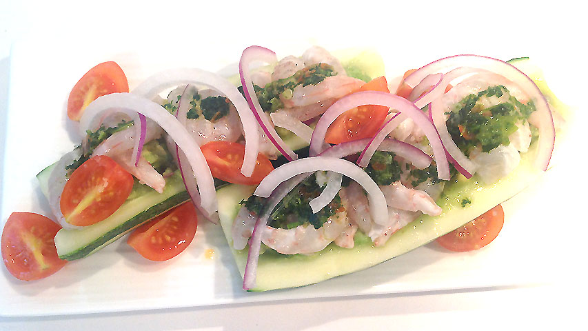 Sirve los platos poniendo las "barcas" de pepino con esta especie de guacamole que hemos hecho en el surco donde estaban las semillas. Las gambas que ya estarán cocinadas por el limón y frescas sobre él. El aguachile en mayor o menor cantidad -a tu gusto-, la cebolla roja y blanca en juliana decorando por encima y un poco de ralladura de la piel de un limón.