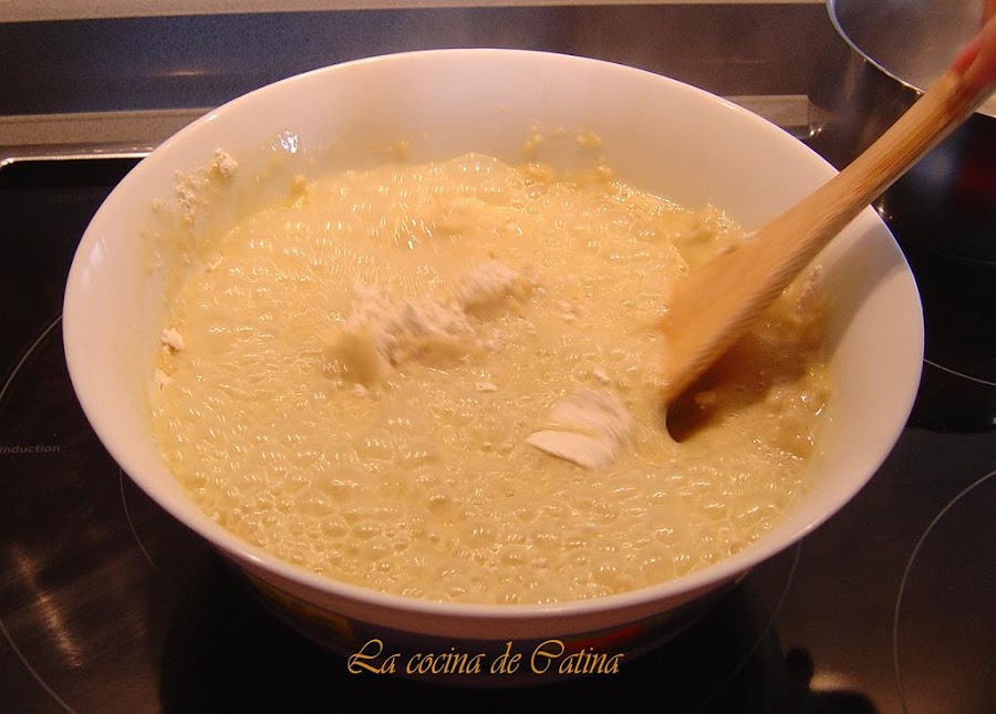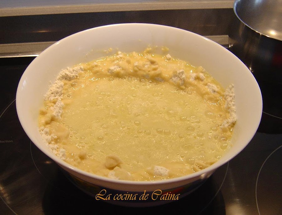 Ponemos la harina en un recipiente resistente al calor, hacemos un hoyo en el centro y vertemos el aceite hirviendo para escaldar la harina.