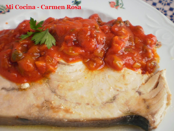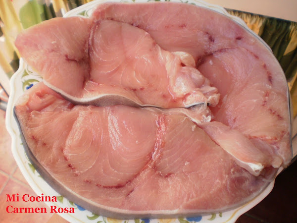 Conocido mayormente como pez espada, emperador, espadarte, ?peix espasa? o ?txitxi espata??.tiene su nombre técnico: ?Xiphias gladius? es la aguja palá que suelo comprar en el Mercado de Huelin, donde Salvador, expone la cabeza mientras corta éstos deliciosos trozos que llegaron a Mi cocina.