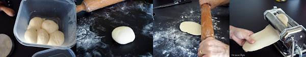 Enharinar la superficie de trabajo, aplanar la bola y con el rodillo de amasar (o con una máquina de elaborar pasta fresca si disponemos de ella, aunque no es necesaria), estirar la masa hasta conseguir una capa bastante fina.