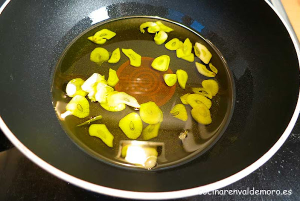 Los echamos en la sartén con el aceite y los sofreímos a fuego muy lento (mi vitro va del 1 al 6 y yo los sofrío al 1, o como mucho al 2)