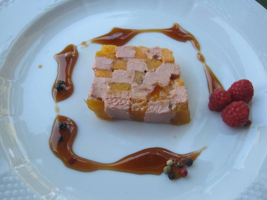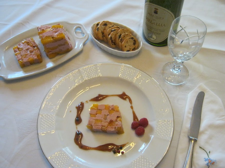 En un molde apropiado (rectangular) colocar intercalando tiras de foie-gras y de mango formando un ajedrez. Echar por encima la gelatina de moscatel y guardar en la nevera hasta el día siguiente.