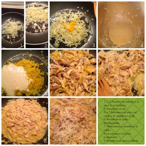 Añadimos el pollo previamente deshilachado y terminamos añadiendo la leche evaporada.