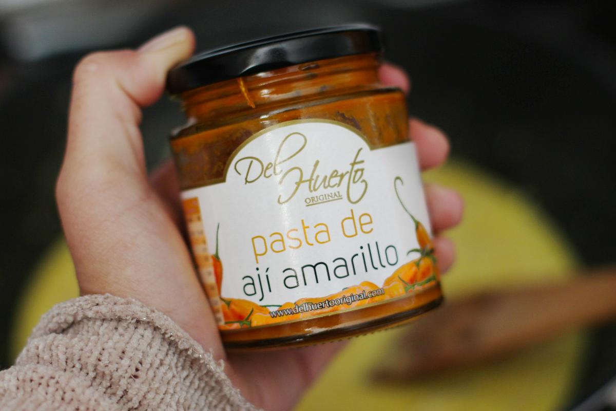 Esta receta, como su nombre lo dice, lleva ají amarillo, un tipo de ají (chile) peruano que le aporta un lindo color y mucho sabor a este plato. Yo suelo conseguirlo en grandes supermercado en su versión en pasta (que dura muchos meses refrigerada).