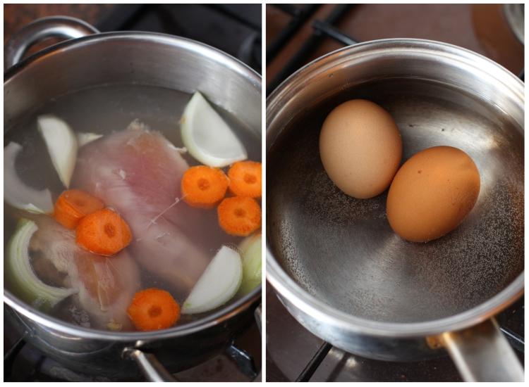 En una olla con aprox 1 litro de agua agregar las pechugas de pollo, 1 zanahoria en trozos, 1/2 cebolla y una cdta de sal y una pizca de pimienta. Llevar a ebullición y bajar a fuego medio. Tapar y cocinar durante aprox 20 minutos hasta que se cocine bien el pollo. Al mismo tiempo poner 2 huevos en una olla pequeña y cocinar durante aprox 10 minutos para que queden duros. Pelarlos, cortarlos en gajos y reservar.