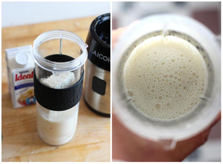 Mientras cocinamos el pollo, en una juguera o procesadora agregamos 200 ml de leche ideal junto con las rebanadas de pan (sin orilla) y trituramos bien. También picamos la 1/2 cebolla que nos queda y 2 dientes de ajo.