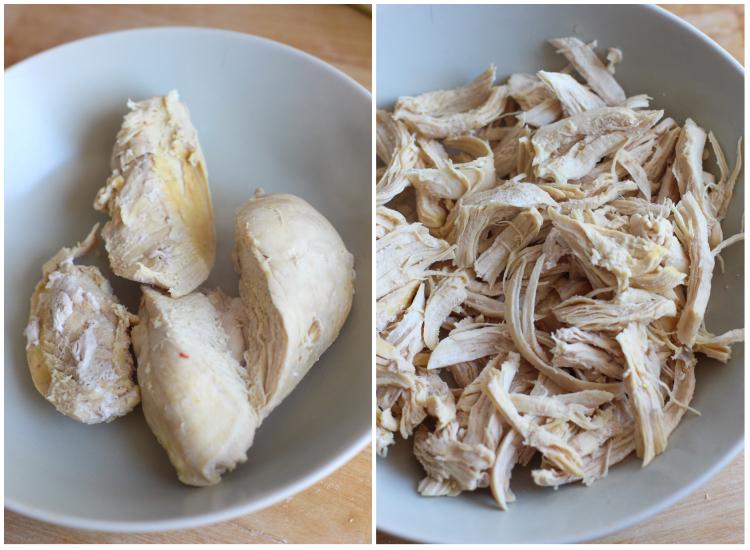 Sacamos el pollo del agua (reservamos el caldo) y dejamos enfriar por unos minutos. 4️. Desmenuzamos con las manos el pollo para obtener tiras.