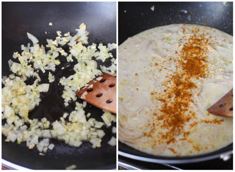 En una olla o sartén agregamos 2 cucharadas de aceite, la cebolla y el ajo picado y salteamos durante algunos minutos. Luego añadimos el pollo desmenuzado, 2 tazas del jugo de la cocción del pollo, la mezcla de leche y pan licuado, 1 cucharada de palillo y 1 cdta de pasta de ají amarillo.