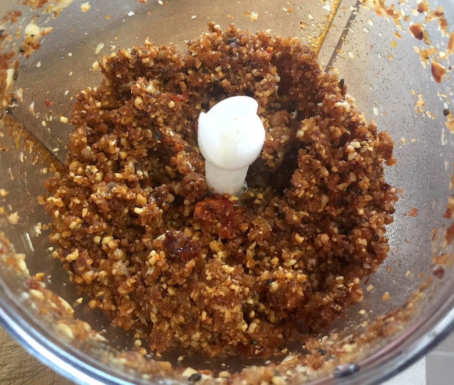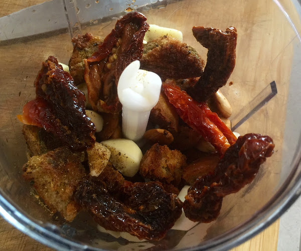 3. En la trituradora majaremos el pan tostado, las almendras, los dientes de ajo, el clavo, el comino, y los tomates deshidratados. El majado debe quedarnos algo grueso así que tampoco conviene triturarlo en exceso.