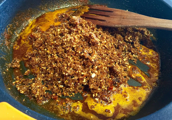 5. A continuación añadimos el majado, integramos con el pimentón y añadimos un poco de agua hasta que tome textura de salsa más bien líquida. Ponemos la mitad de la rama de canela.