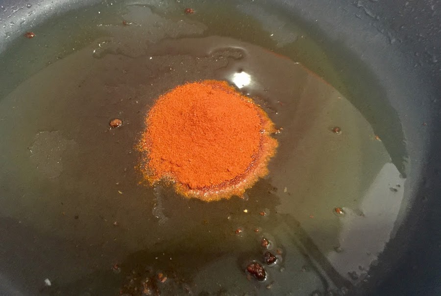 4. En la cazuela donde hemos frito el pan aún nos quedará aceite, así que volvemos a calentar el fuego, sobretodo a fuego bajo. Ponemos en el aceite la cucharada de pimentón y rehogamos durante 1 minuto.