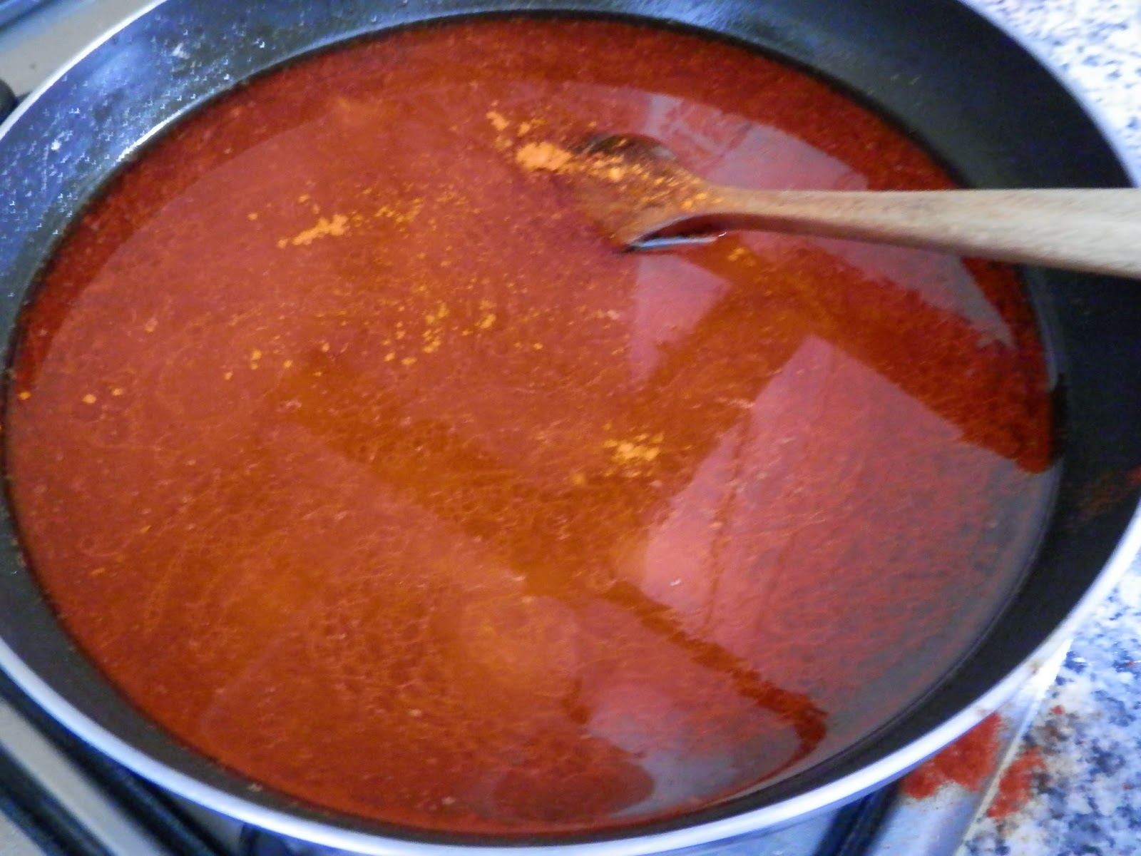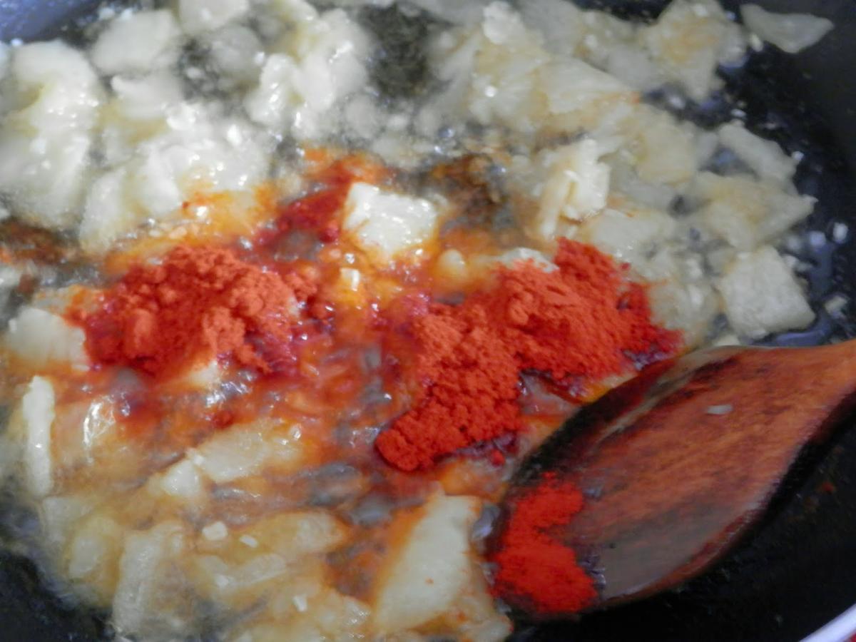 Ahora añadimos dos cucharadas de pimentón dulce y apartamos del fuego mientras removemos para que no se queme, si el pimentón llegara a quemarse, amargaría.