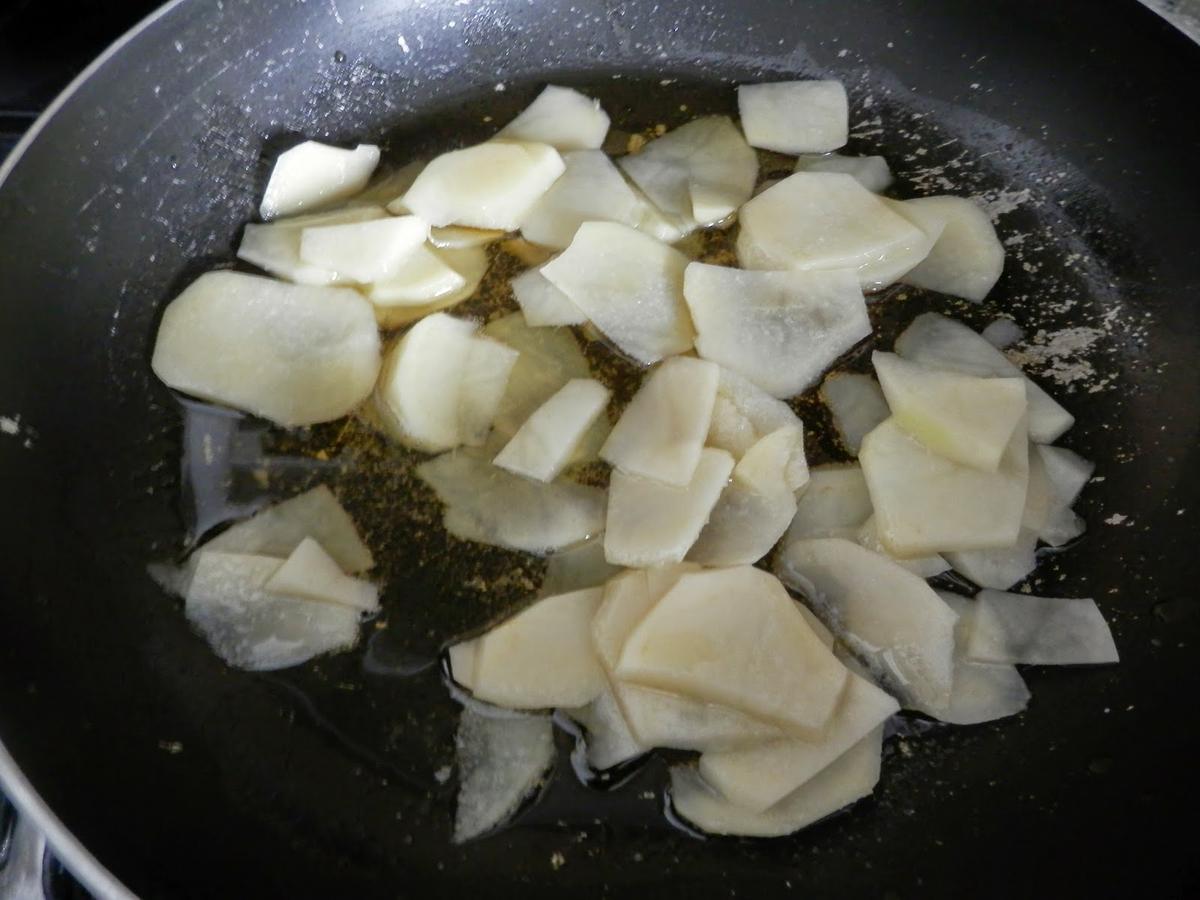 Se pone aceite en la sartén y se sofríe la patata.