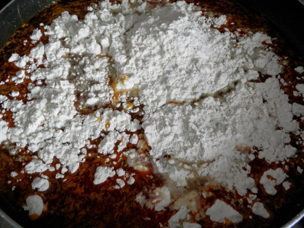 Cuando ya esté todo más o menos incorporado, añadiremos la harina y daremos vueltas con el fin de que no se hagan grumos.