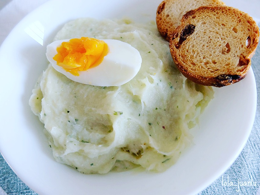 Una vez las patatas estén tiernas, las introducimos junto con el bacalao en el vaso del procesador de alimentos y las batimos junto con el ajo, el perejil y un chorreoncito de aceite. Agregamos un cazo de caldo de la cocción y batimos nuevamente. Lo probamos y, si lo vemos necesario, salpimentamos y le añadimos más caldo de la cocción.