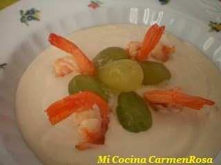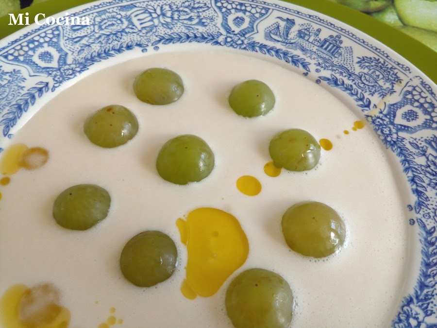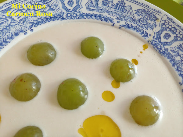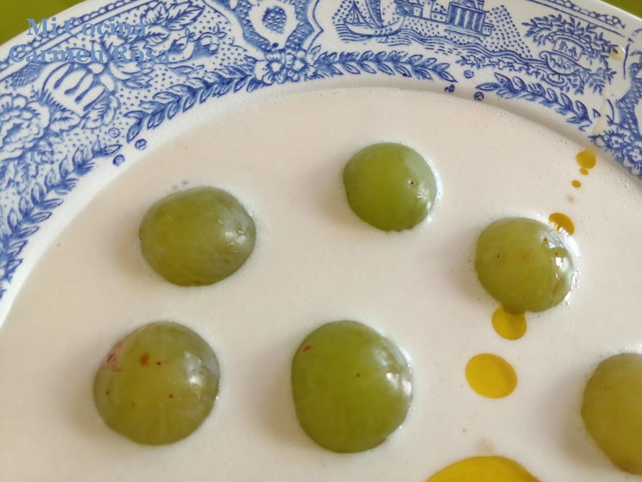 Para servir, colocar las uvas en el recipiente (en ésta ocasión en un plato) y echar el ajo blanco,
