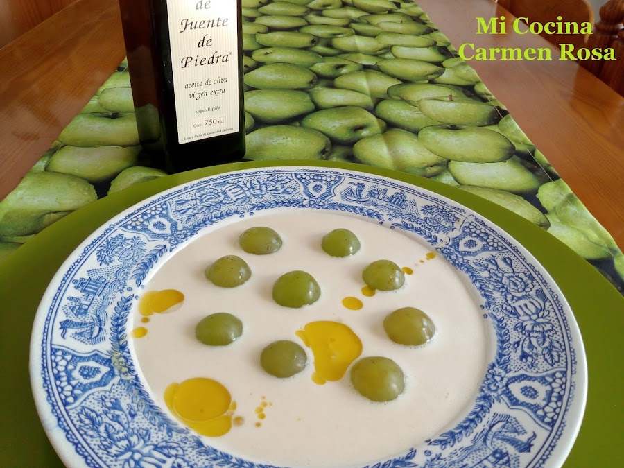 La forma tradicional de elaboración del ajoblanco manda majar en un mortero los ajos y las almendras con un poco de sal. Luego añadir el pan remojado y hacer una pasta a la que le vamos añadiendo el aceite para que ligue. Se le añade entonces el vinagre y finalmente el agua bien fresca, pero debo reconocer que lo preparo usando una minipimer, así que si les parece tengan una a mano y les explico….