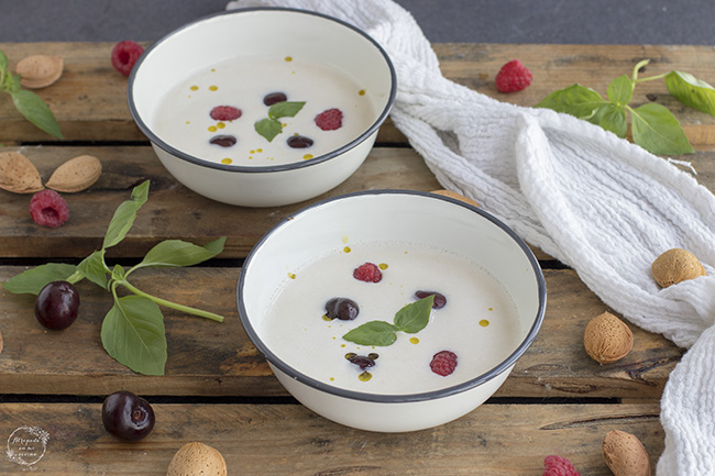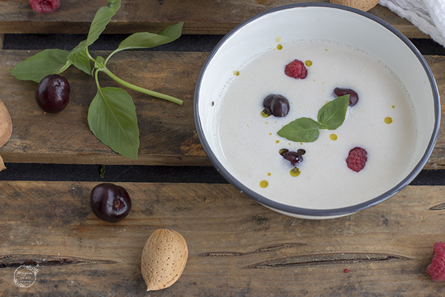 Ponemos en remojo el pan durante unos diez minutos. Después añadimos el pan y el agua a la batidora, añadimos el AOVE, las almendras y el vinagre. Trituramos todo y salpimentamos al gusto. Llevamos al frigorífico durante unas horas y a la hora de servir añadimos frambuesas y picotas (las podemos deshuesar) y unas hojas de albahaca. Regamos con un poco de AOVE y servimos.