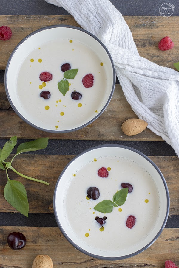 Hace años publiqué la versión de un ajoblanco más tradicional, servido con uvas, y más espeso que éste. También publiqué otro ajoblanco "diferente" de melón y langostinos. El de hoy es una sopa fría que con el toque de las picotas y las frambuesas le aportan frescura, combinado con unas hojitas de albahaca fresca. Mucho más ligero que el primero que os dejaba y que servido en cuencos es un entrante ideal o en vasitos se convierte en un sorbo o aperitivo para iniciar cualquier comida veraniega.