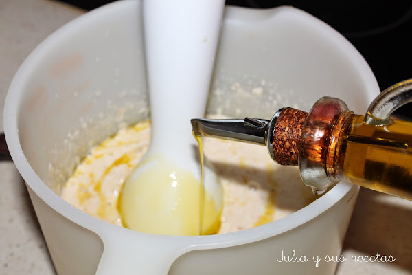 Lo batimos todo muy bien y vamos añadiendo el aceite poco a poco mientras batimos como si se tratase de hacer una mayonesa.