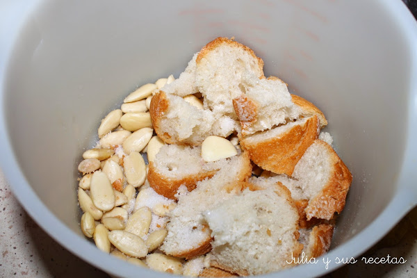 En el vaso de la batidora ponemos, las almendras, el pan, el ajo, un poco de agua, sal y vinagre al gusto.