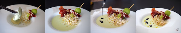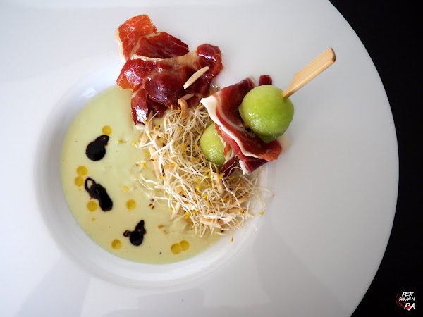 Fusión de estilos y técnicas, tradición y vanguardia, raíces mediterráneas, producto de calidad y una cuidada elaboración y presentación son sus señas de identidad. En la receta que os presentamos, Ajoblanco de melón con ensalada de germinados y brocheta de melón con jamón, hemos intentado ser fieles a ellas.