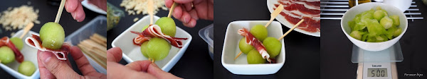 Para montar las brochetas, ensartar una bolita de melón, una loncha de melón plegada y cerrar con otra bolita de melón. Reservar en la nevera hasta el emplatado.