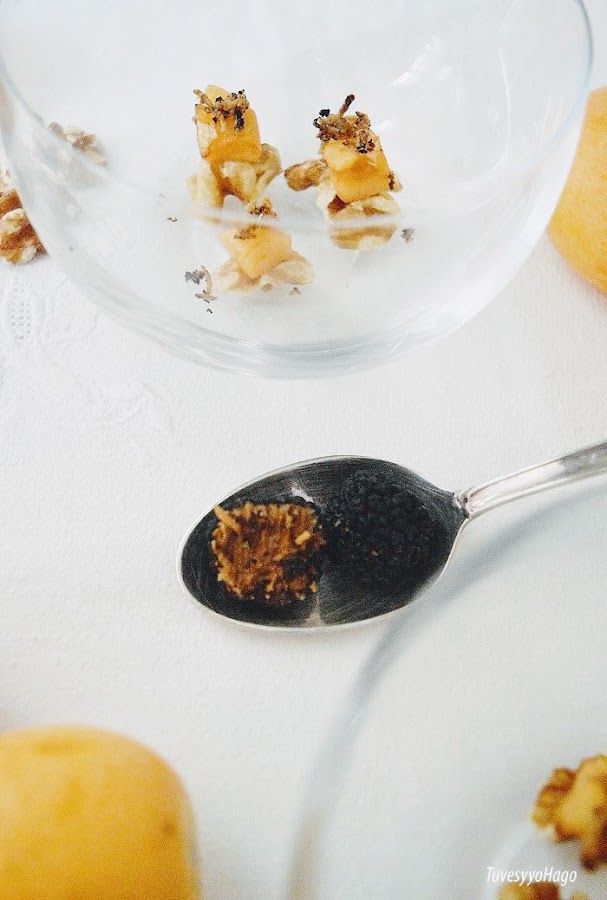 Por eso yo le he dado la vuelta a este plato de mi tierra y lo he preparado con nueces gentileza de NUECES DE CALIFORNIA sirviéndolo acompañado con nísperos y trufa negra rallada.