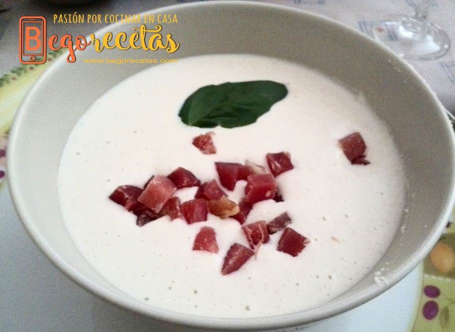 Hoy os traigo una que a nosotros nos gusta mucho, y que bien fría os va a resultar deliciosa. Este ajoblanco, elaborado principalmente con almendras y que podéis acompañar con unos taquitos de jamón serrano, como os muestro en mi foto, y si queréis darle un toque diferente probadlo con uvas. Os aseguro que el resultado is encantará.