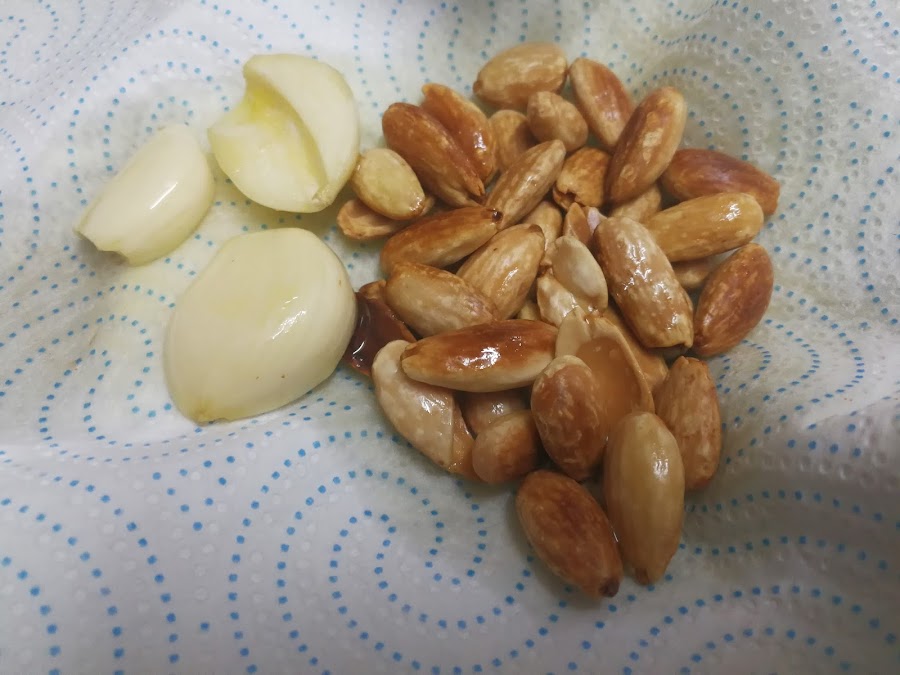 Ahora estamos ambas, recuperando esas comidas de antaño. Sus recuerdos son escasos, pero como se acuerda más de lo más lejano, aprovecho eso, y lo que encuentro por internet, y ahí vamos tirando, poco a poco. Este plato es uno de ellos. La salsa la utilizaba mi madre en muchas otras recetas. Unas veces con almendras o sin ellas, con comino, con orégano; con vino blanco o sin él, según el plato que hiciera, así tenía uno u otro de sus ingredientes. Pero El pan, y el ajo, casi siempre estaban presentes.