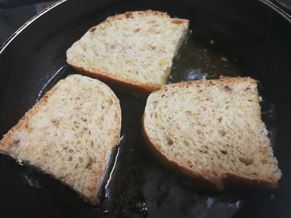 En el mismo aceite, echa las rebanadas de pan y frie. Saca también y reserva.