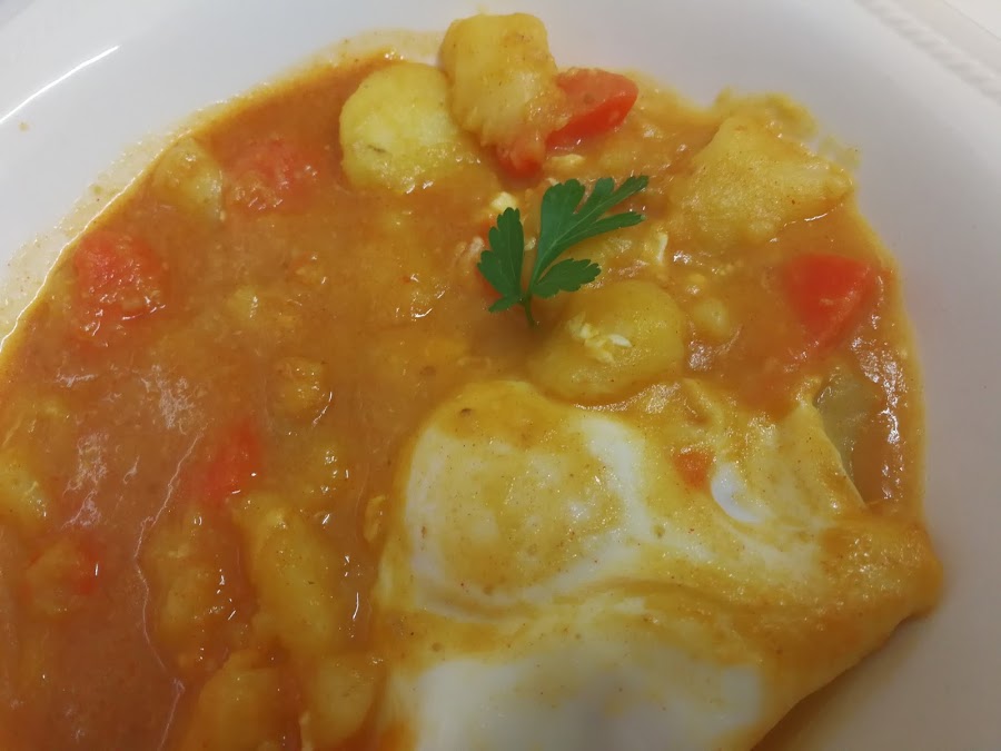 En los últimos minutos, casca dos huevos con cuidado, y escalfa en el caldo. A mí no me gusta muy caldoso, pero puedes dejarlo con un poco más de caldo.