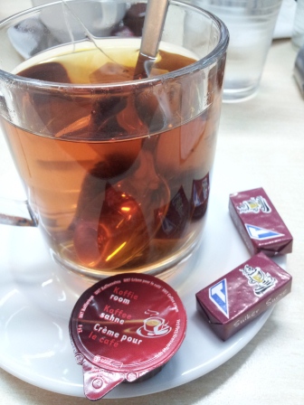 Desayuno típico: Gofre con chocolate. Me pareció un poco caro, pero es que somos turistas. Y también me sorprendió que ni el gofre ni el chocolate estaban excesivamente dulces. Y más todavía que hay 2 tipos de gofres! Los belgas y los de Liège. Unos llevan el azúcar por fuera y el otro por dentro.