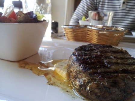 Como puntualización especial, te daban a elegir entre salmonetes (lo tuvimos que buscar en el diccionario) y solomillo. Yo lo siento por los de dieta sana, pero es que si me ofrecen carne, muy harta tengo que estar para decir que no. Este estaba muy bueno, y te lo servían sobre una rodaja de mantequilla de ajo. que se iba derritiendo según pasaban los segundos. Una delicia para la vista y para el gusto.