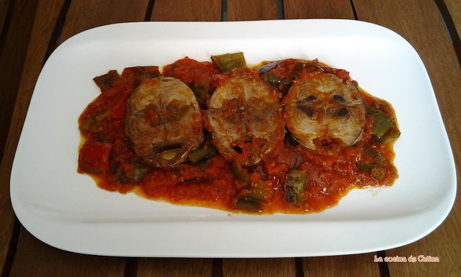 En la fuente de servir ponemos el frito de tomate y pimiento y encima las rodajas de pescado.