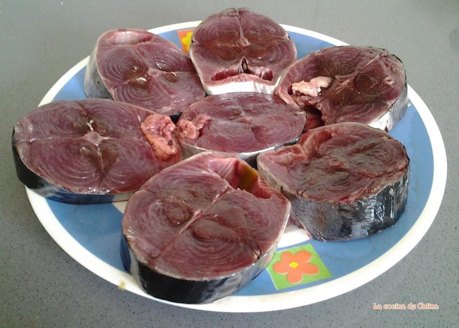 Una albacoreta de un kgr limpia y cortada en rodajas